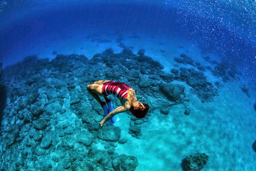 Chrystal Dawn Fitzgerald wears the Riviera One-Piece in Rosa in the clear blue waters of Tonga. Photo by Ming Nomchong. |