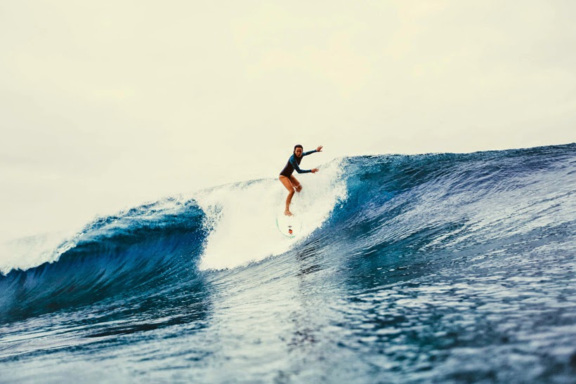 Chrystal drops into a fun wave in Tonga wearing the Gaviotas One-Piece. Photo by Ming Nomchong. |