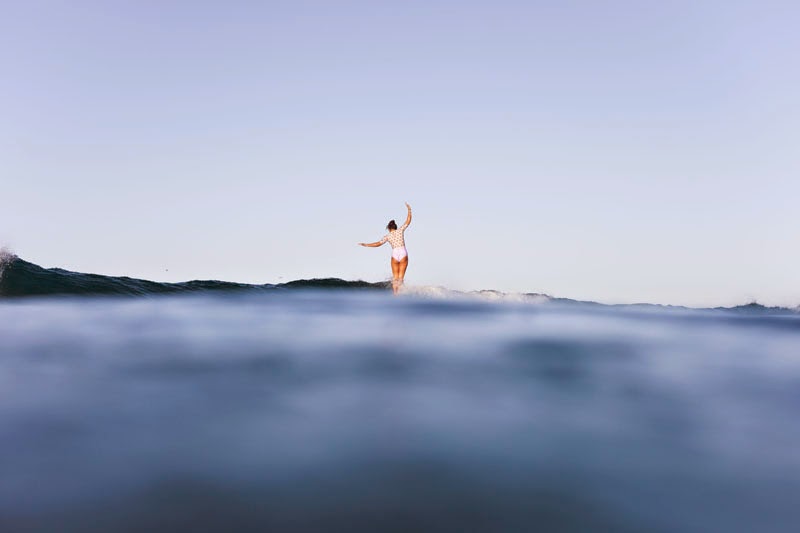 | Lola Mignot surfs her Bing longboard in the Zuma Surf Suit in Rose Petal. Photo by Luki O'Keefe. |