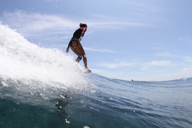 Pro Snowboarder Marie-France Roy surfing in Togat Nusa in the Seea Hermosa Swim Shirt. Photo by Damea Dorsey. |