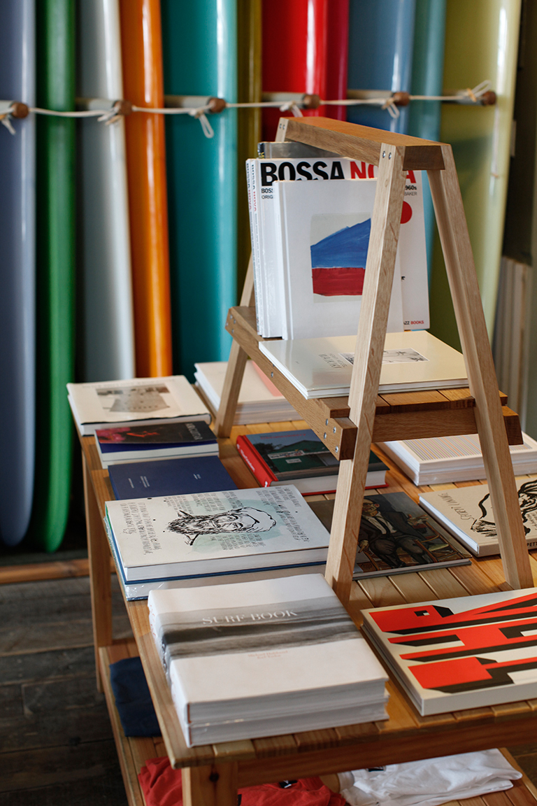 Co-founder Erin Norfleet Gentile (and wife of co-founder of Chris Gentile) explains, “It’s exciting to watch people come into the door and discover things. For example, possibly being challenged by the fact that there's a book on Italian painter Giorgio Morandi sitting next to a rack of George Greenough fins shelved next to a hearty winter jacket designed in Denmark which hangs in front of a rack of Josh Hall, Fineline or Andreini boards – all of which are relevant to us!”