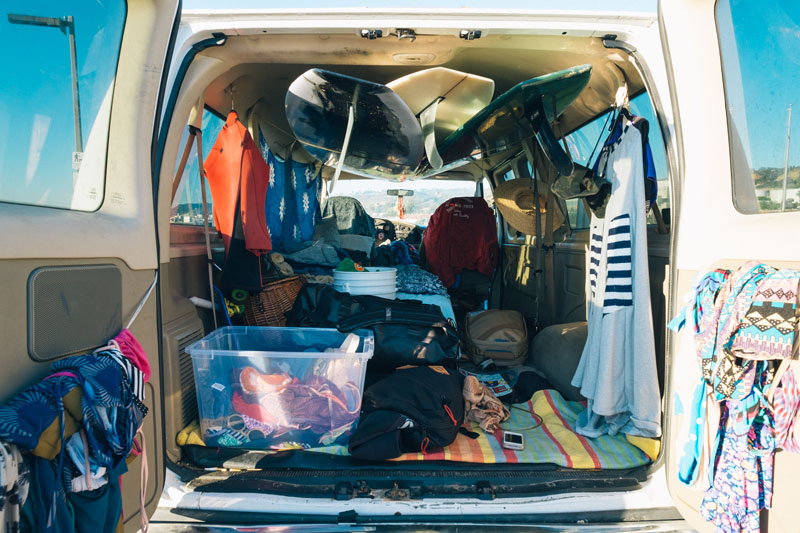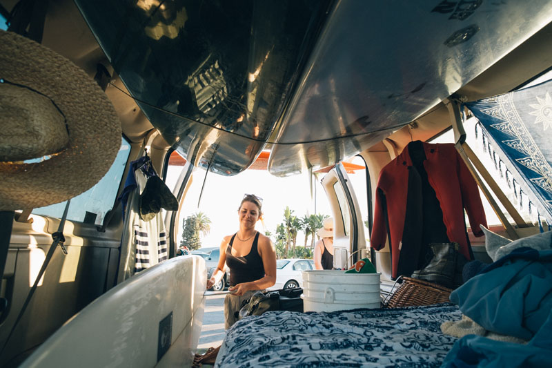 "Surfboard storage inside and up top. Comfy bed, so you can get up and surf in the morning without a sore back. Plenty of water, good drinking water, and shower water now because of the drought, there's a lack of beaches with showers. Toiletries.