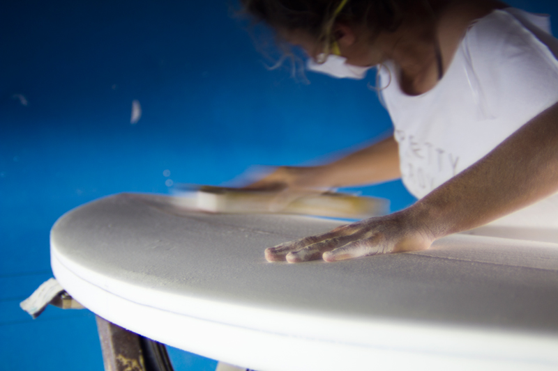 | Farm to table version of surfing: shaping your board and then surfing it. Leah Dawson shapes her second board at the Joyas Surfboards workroom. Photo by Mauro Ladu. |