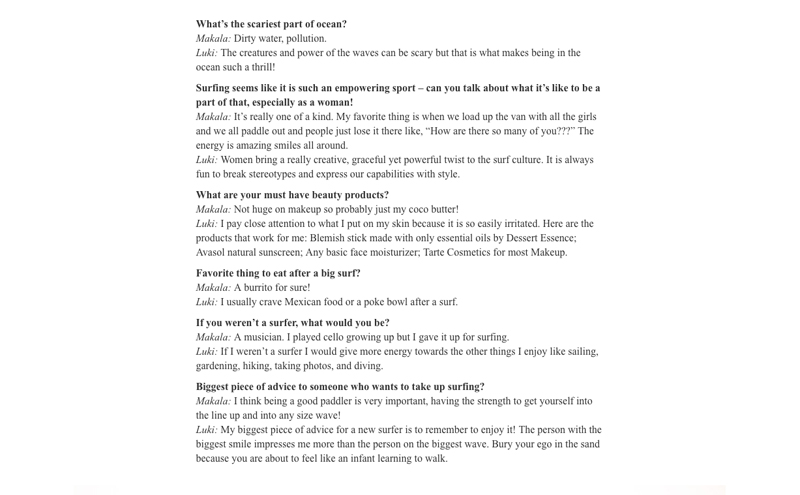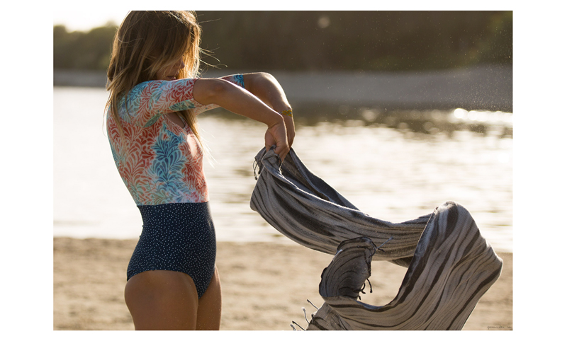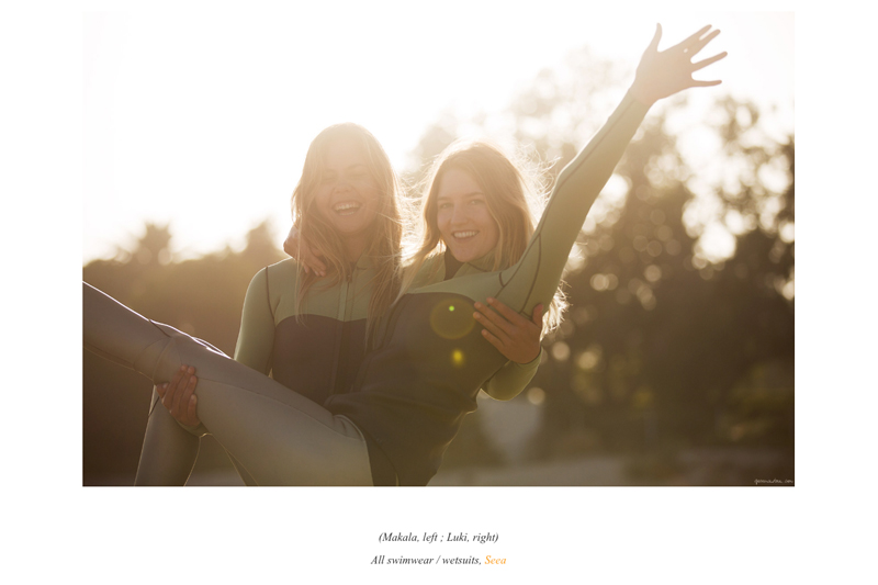 Left, Makala wears the Zuma One-Piece in Verano. Luki wears the Rincon Neoprene Jacket. |