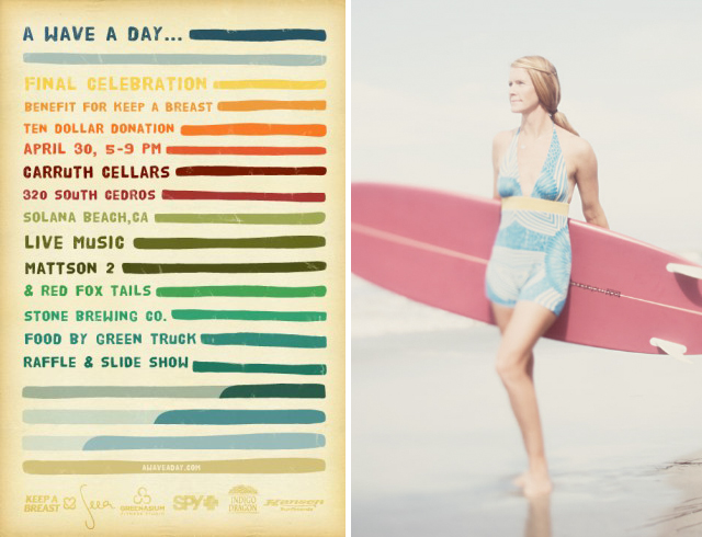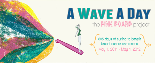 Congratulations to our friend Sarah Kobach Hughen for accomplishing her mission of surfing "A Wave a Day" for 365 straight days!! Sarah's efforts to benefit breast cancer awareness took her down a special course, and every time it was pouring rain out, or the coast was getting pounded with heavy swell, we would think of Sarah and send her love and positive thoughts, because no matter what - she was paddling out! Her journey, now at an end, has touched many lives. The celebration of those efforts will be tonight at Carruth Cellars in Solana Beach, so come on out!
