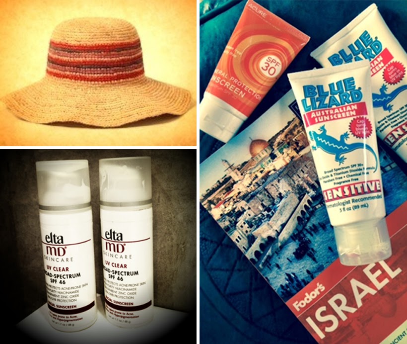 Timna's favorite wide brimmed hat, sunscreen by Blue Lizard, Acure Organics and EltaMD for face. |