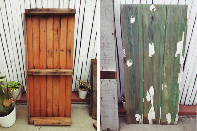 An section of oak flooring (left) and nicely weathered fence door (right), salvaged from an old house in Orange, CA |