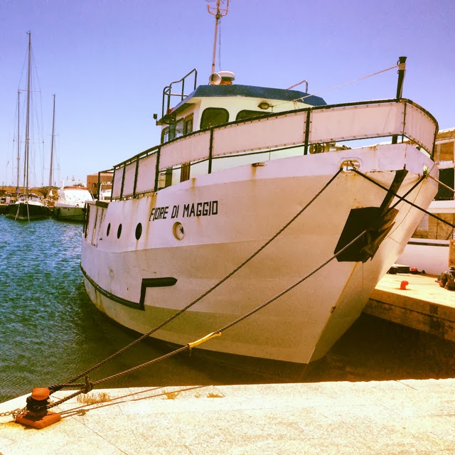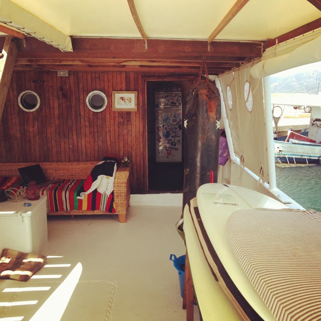 I love so much to wake up in the harbor. I'm such a dreamer and my spirit gets big nourishment every morning. My boyfriend is a sailor, a surfer and a fisherman, he's such a great waterman. Everyday is a small adventure. We live in South Sardinia, and it’s always warm and sunny. The boat is old school, very comfortable, and there is a lot of space for chilling and creating. My main activities are: surfing, painting, swimming, reading, thinking, and fishing. The worst thing that could happen to me would be go back living in a normal house!