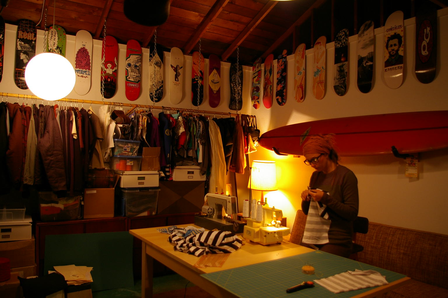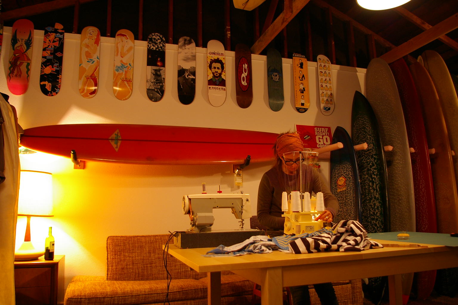 View of the man cave turned sample room. That's a 60's Hobie Pig on the wall, and Brian's board collection up top!
