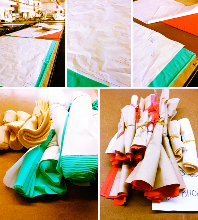 It's pretty cool to see a skilled worker in action. Equipped with a large, motorized "straight knife", an experienced cutter can slice through hundreds of layers of fabric at the same time. Here's a quick clip of our man in action, cutting out pieces for the samples of the new Polkadot Swami's! (coming to stores next week!!)