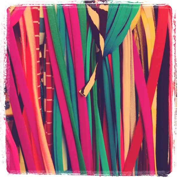 As you can see, the process is pretty simple: Cut and unroll the fabric in an empty box, feed it into the machine, and out comes your pasta! This ingenious little device has a separate pickup in the back for the actual elastic strap, and in one smooth motion, the machine wraps the spandex around the elastic and sews it in place - pretty neat! All you need to do afterwords is measure and cut the straps to the right length, and you're done!!