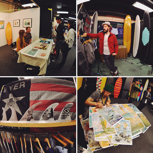 Surfer/Artists Tyler Warren, Mason Dyer, and Harry Daily holding it down. At the end of the second day, some Japanese collectors came and bought out Tyler's whole booth. Crazy!