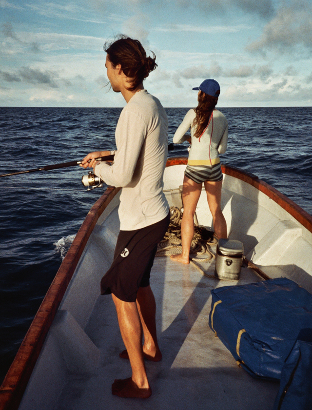 Trevor Pai and his wife Jenna (wearing the Seea Swami's Playsuit in Waterstripe) fishing off the coast of Tavarua. |