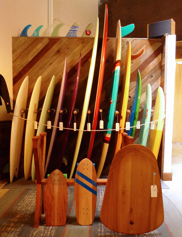 | Board display. Sawyer stocks boards by local shapers Ashley Lloyd and Travis Reynolds. |